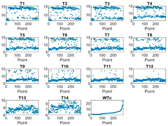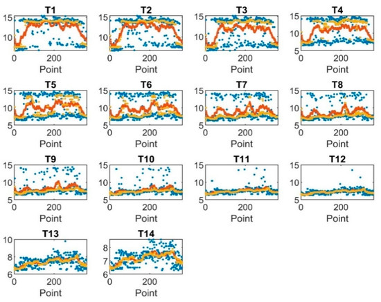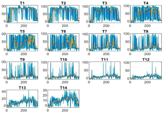 Hence the data was smoothed using the moving average filter and median average filter, as shown in Figure 7. The graph shows that T1, T2, T3, and T4 were more smoothed by the mean average filter, T5, T6, T7, T8, T9, and T10 were more smoothed by moving median filter, whereas T11, T12, T13, and T14 show the same smoothing magnitude for both smoothing techniques at the same frame length. The frame length for both filters was 20.