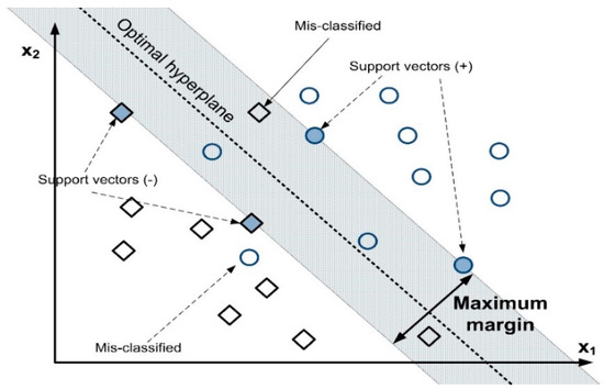 The supervised method (the most-isolation approach) is the support vector machines method. By supplying numerical data, it solves classification and regression problems [47]. The precise location for the hyperplane is determined by the support vector machine process through optimization until the hyperplanes are positioned in the maximum margin [48]. The hyperplane with the highest margin is capable of accurately classifying data or other input parameters [49]. The key concern in support vector machine (SVM) is how to determine the hyperplane’s ideal position. The most acceptable position should be chosen after conducting many tries. The hyperplane’s main function is to divide the two classes. Thus, widening the decision boundary between the two classes is suitable. The line crossing across the support vector is referred to as the separate lines to indicate the decision boundary. The concept of SVM is depicted in Figure 10.