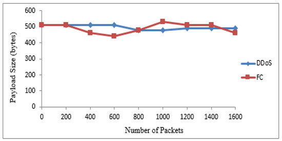 The second parameter considered is the size of the packet payload. The analysis of payload size can be used to differentiate DDoS attacks from FC traffic. It is obvious that DDoS attacks are initiated by using some attack tools or prebuilt programs. These tools usually generate attack packets of the same sizes or same data patterns, while in the case of FC, all the packets are generated from different legitimate users. Each node may require its particular operation to be performed. Therefore, the packet sizes and their patterns will be not similar in general cases.