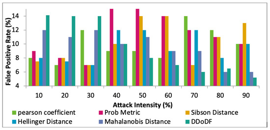Furthermore, the performance of the proposed DDoDF is compared with the existing mechanisms, Hellinger distance [8], Sibson distance [19], probability metric [20], Pearson coefficient [21], and Mahalanobis distance [24], while having two real datasets taken. The intensity of attack differs from 10% to 90%. Figure 11, Figure 12 and Figure 13 show the comparative results of the selected mechanisms with our mechanism. Varying attack intensities are taken. The attack intensity is measured based on the data traffic rate. The normal traffic rate is compared with the suspected abnormal traffic. If both are equal, then the attack intensity is equal to 0%. The highest known difference between the two traffic rates is assumed to be 100%.