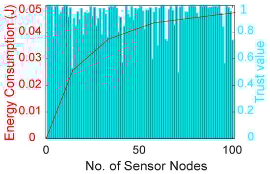 | L1: Presence of malicious nodes | S1: Trust evaluation considering NCQ value to remove malicious nodes from the network | V1: Trust values of the SNs, FNR, FPR and DA. The results are depicted in Figure 2b and Figure 3a,b |