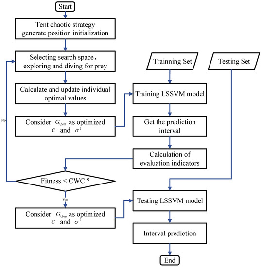 Note that there are some unknown parameters in the kernel functions of LSSVM that need to be selected in advance. Generally, these parameters are determined according to experience, which may be time-consuming, and it is difficult to find the optimal parameters. Nowadays, swarm intelligence optimization algorithms are researched extensively, since the optimal solution can be found by swarm intelligence to perform a collaborative search mechanism. The results of the combination of swarm intelligence optimization algorithms and machine learning methods can be found in a large number of references. In [33], a hybrid model of particle swarm optimization (PSO) and support vector machine is proposed to predict the turbidity and pH value of sand filtered water in irrigation systems. Han et al. use an adaptive PSO algorithm to design self-organizing radial basis function neural networks to improve the accuracy and save time [34]. Chen et al. study the artificial bee colony optimization back-propagation network to predict the water quality of a water diversion project [35]. Fan et al. use the LSSVM model to improve the performance of predicting the safety factor of a circular slope [36]. Mahdi Shariati et al. use the gray wolf algorithm to optimize ELM model parameters to predict the compressive strength of partially replaced cement concrete [37]. However, to the best of the authors’ knowledge, these swarm intelligence methods may fall into local optima and do not find the global optimal solutions.
