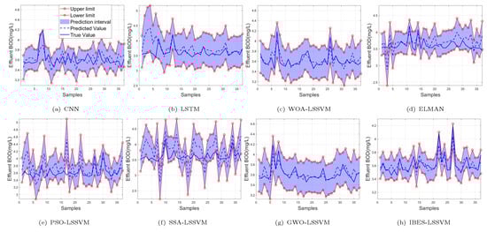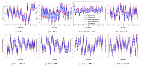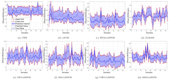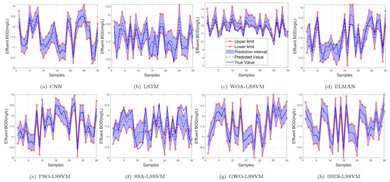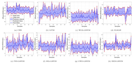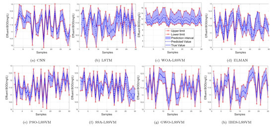 - In order to estimate the uncertainty of the model prediction results and make better decisions, after obtaining the point prediction results, the interval prediction bounds of effluent quality are also generated. Compared with some existing soft-sensing models, the proposed interval prediction method can obtain a more accurate prediction range.