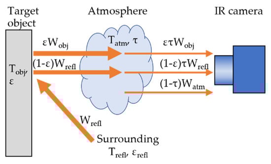 where τ is the transmittance of the atmosphere. The reflected radiation assumes that reflection temperature Trefl is the same for all reflections from surroundings, and the emissivity of surrounding surfaces εrefl is assumed to be one. Radiation from the object and reflected radiation are absorbed by the atmosphere during traveling. Atmospheric radiation is emission from the atmosphere between the object and the camera at ambient temperature Tatm. “1 − τ” indicates the atmosphere’s emissivity, and τ depends on Tatm, relative humidity, and measurement distance between the target object and the IR camera. Therefore, accurate surface temperature measurements need to be compensated for the effects of emissivity ε, ambient temperature Tatm, relative humidity, reflection temperature Trefl, and distance [76].