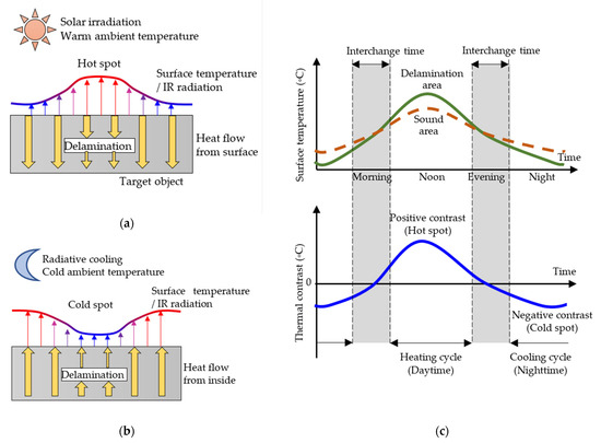 From early morning to noon, solar radiation increases, and the ambient temperature rises. Solar irradiation and warm ambient temperature heat the surface of a target object, creating heat flow to the inside of the object. The thermal conductivity of concrete is approximately 1.6 W/mK, while that of air, filling delamination, is significantly low at 0.024 W/mK [88]. Thus, delamination acts as insulation and disturbs heat flow. As a result, the surface temperature above delamination becomes higher than the temperature of the surrounding area. Delamination areas appear as positive thermal contrast or hot spots in IR images, as shown in Figure 3. This period during daytime is called a heating cycle [89].