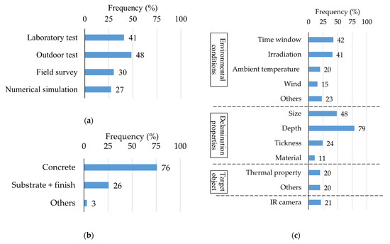 Figure 4b shows that concrete was used as the target object in 76% of the previous studies because concrete is a fundamental and prevailing material in infrastructures and building structures. On the other hand, the substrate with finishes, the main materials in building facades, was at a low frequency of 26%. Substrates were mainly concrete, but few studies have examined the effects of bricks [162] or stones [54]. Finishes were tiles and mortar renders attached to substrates [109].