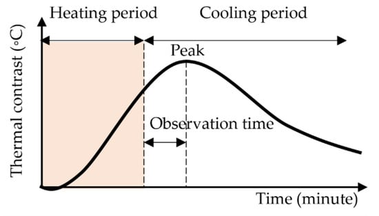 Thermal contrast, called ΔT, is referred to the surface temperature difference between the delamination area and the sound area [88,100]. Thermal contrast is a primary quantitative indicator to evaluate delamination in previous studies [10,88,103]. Thermal contrast may be due to causes other than delamination, such as surface conditions, subsurface materials, or object shape.