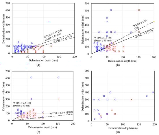 The detectability of IRT is affected by many factors, including environmental conditions, delamination properties, target objects, and IR cameras [52]. Thus, the existing standards and guidelines of IRT state recommended conditions as mentioned in Section 4.3. However, these recommendations are not sufficiently quantitative and explicit. Furthermore, it is not practical for all the surfaces of an infrastructure to meet these recommendations, such as solar irradiation for a long duration. In addition, environments differ depending on the survey region. Therefore, affecting factors and these impacts on detectability were studied. Table 2 covers studies over the last 20 years on these factors using different environmental conditions, delamination properties, target object, and IR camera. This section compiles and discusses experimental methodologies adopted.