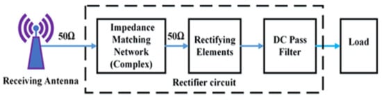 Due to its simplicity in construction, self-powered low-power electronics devices have attracted remarkable attention for numerous wireless applications such as healthcare sensors, smart cities, Internet-of-Things (IoT), actuators and wireless sensor networks (WSNs) in the last couple of years. Due to the importance of batteryless devices and maintenance cost-related issues in the conventional battery-operated system, the market for such energy scavenging technologies is growing continually. Despite significant developments, the battery’s lifespan is still limited, and their replacement is always complicated, requiring regular maintenance. In addition, in the power conversion process, a large amount of energy is wasted for charging various electronic systems such as mobile phones, tablets, smartwatches, e-readers, pin pads and other sensing components. Energy harvesting techniques from different energy sources (i.e., radio frequencies, solar, and thermal) available in an ambient environment can solve this issue [1]. RF energy harvesting is the most favourable technique of converting microwave energy to dc electrical energy from the ambient environment, the concept of which was developed in the early-1990 era [2]. The key components of the RF energy scavenging system are depicted in Figure 1.