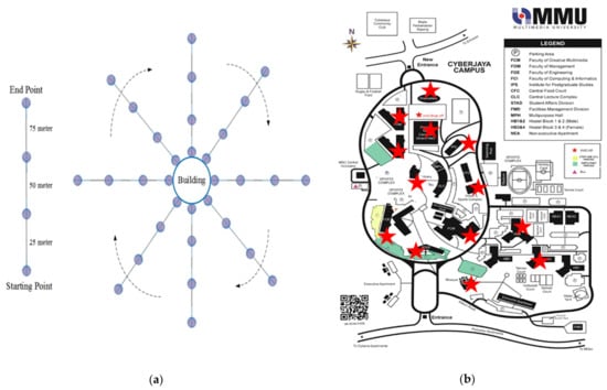 (a) The proposed strategy of RF spectral survey for each survey point, (b) map of the MMU area indicated RF survey points [21].