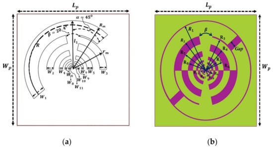 On an FR4 substrate material with a relative permittivity () of 5.4, loss tangent (tan δ) of 0.02, and a height (h) of 1.6 mm, the suggested self-complementary log-periodic frequency-independent toothed planar multiband antenna is made. The overall dimension of the substrate is 160 mm × 1 60 mm, which equals 0.29λ0 × 0.29λ0 at 550 MHz as shown in Figure 4. It is an extension of the bow-tie antenna with all teeth circularly spread on both sides. The antenna consists of 12 radiators (called teethes of the antenna) and the apex angle of each tooth is 45° where the boom angle is 20.4°. The tooth’s mth number is demonstrated by an outer radius and inner radius defined as [22].