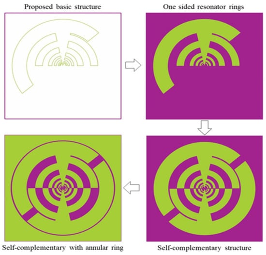The proposed antenna’s sequential design process, a two-armed log-periodic self-complementary dual-arm teeth structure with a separate port and annular ring shape.