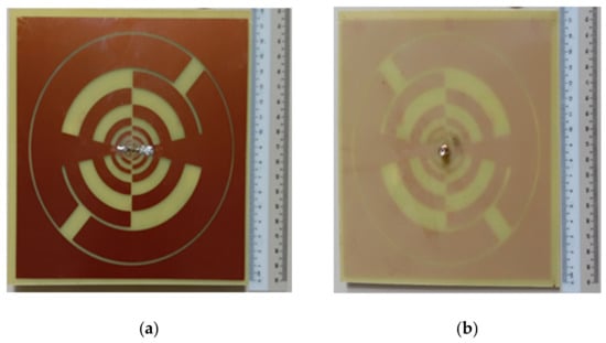 To improve the overall antenna performance (i.e., gain, BW, radiation efficiency), the core radiating element is arranged in a font-to-font fashion that looks self-complementary. Finally, with a gap of 0.25 mm, an annular circle is built around the self-complementary radiating portion. This annular configuration is connected to the antenna edge and serves as a lower frequency radiator [23]. The full annular shape is connected to the antenna’s other rings and functions at the lower resonance frequencies as a radiator. One arm of the antenna is attached to the inner conductor of the 50 coaxial cables, while the outside conductor is linked to another arm that is called ground metal. Figure 6 shows the fabricated prototype images (i.e., front and back sides) of the suggested LP antenna.