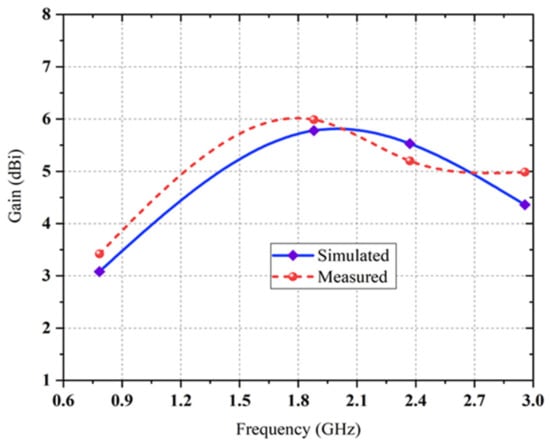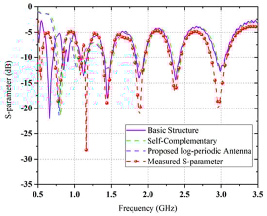 S-parameter (S11) expresses the connection among input and output ports in the transmission of electric system. It represents the excellence of the impedance matching between the input source and the transmission line’s output load. For any proposed antenna, the value of the reflection coefficient (S11) is considered when it is less than −10 dB [24]. The comparison between simulated and measured scattering parameter S11 [dB] versus frequency of three distinct design stages are depicted in Figure 7, where overall performance is in good agreement. It is examined from Figure 7 of the S-parameter (S11) that the propagating EM wave traverses the −10 dB line thrice from 0.5 to 3.5 GHz range.