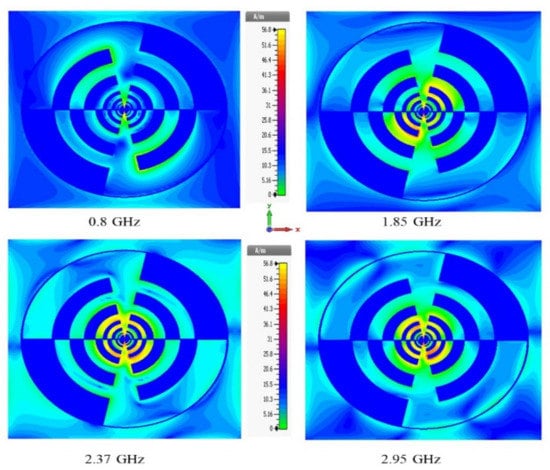 The surface current distribution at operating frequency bands (i.e., 0.78 GHz, 1.8 GHz, 2.38 GHz and 2.9 GHz) on the novel rings log-periodic antenna.