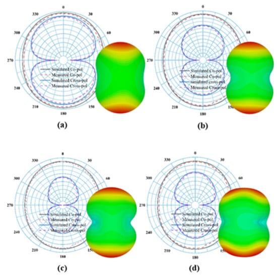 The measured co-polarized maximum realized gain is approximately 6 dBi across all RF operational frequency bands from 0.5 to 3.5 GHz. The somewhat maximum value of cross-polarized realized gain is due to the large radius (R) and a wide-angle on the antenna turnstile ring. The large radius and large angle of the complementary ring are needed to allow for the coaxial feeder line to fit except for shorting the high-frequency radiating elements. The measured and simulated cross-polarized realized gain has a slight variation in which measured gain has a higher value than that of the simulated gain at GSM 900, GSM 1800 and LTE with an exception for the case of 2.4 GHz. From Figure 9, it is noticeable that the surface current on the novel rings or teeth excites radiating elements, mainly at the resonant frequency bands of radiating elements. Moreover, it can be seen that the majority of the current particles exist between inner rings around the center and the outermost rings of the proposed geometry at 1.8 GHz, 2.38 GHz and 2.9 GHz frequency bands (except for 2.9 GHz). At the 0.78 GHz frequency band the surface current density is mostly concentrated at the peripheral region of the second and third radiating rings of the proposed antenna. It is also observed that both the symmetrical rings of the proposed structure interact to produce the multiband operation. The radiation pattern or directivity is the main concern for antenna performance. It characterizes the direction of an antenna at which the signal is radiated in a particular direction. The ratio of two radiation intensities is calculated, while one is defined in a specific direction and the other is the overall direction. The simulated and measured radiation patterns (both 2D and 3D) of the proposed LP antenna at different resonance frequencies across the bands are illustrated in Figure 10. It can be seen that the cross-pol exists within the parameter of the co-pol which indicates good antenna characteristics. From Figure 11, it is observed that the ring-turnstile part of the aperture connection dominating at 0.9 GHz; 1.2 GHz and 1.4 GHz are the frequencies in the transition region where both ring-turnstile and the LP’s outermost teeth contribute to the radiation and the LP dominates at 1.8 GHz, 2.15 GHz, 2.4 GHz and 2.9 GHz. Since the WoW (the variance in the far-field intensity at a given azimuth plane while the elevation angle remains fixed) is very small and the efficiency of the higher order mode is also poor, the stability of the directivity radiation patterns over the entire frequency band is excellent over active regions of all the aperture components.