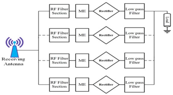 Several rectenna topologies are investigated to realize the energy harvesting technique from multi-frequency bands. The design of an RF bandpass filter is the key element that contains the main difference. The RF filter functionality determines the matching between the antenna and the rectifier input impedance. The input impedance of the rectifier differs with the variation of the number of frequencies and incident power. Moreover, the antenna impedance is a function of frequency. It varies with the variation of frequency bands. Therefore, it is easier to impedance match at a single frequency rather than multi-frequency. Based on these criteria, there are different kinds of losses, while one (impedance mismatch) occurs due to the RF filter circuit’s complexity. These losses due to impedance mismatch over a wide bandwidth are explained in [30,32]. The architectural details of the multiband RF harvester are shown in Figure 11. The variation of a few hundred MHz of an RF band causes impedance disparity, and hence a decline of the RF-to-DC rectification efficiency. The RF-to-DC rectification efficiency is about 8% in the RF band of 1.5 GHz for a harvester topology with an incident input power density of −20 dBm [32]. To obtain perfect impedance matching between the receiving antenna and rectifier circuit, the losses caused by the filter elements are crucially important. This type of topology is not selected for harvesting energy from the entire RF frequency bands. Finally, energy harvesting from multi-frequency bands can be possible by using stacking some harvesters. In this situation, the RF filter circuit is designed using a specific center frequency and the harvesters generated dc voltages connected to the identical load [33,34]. In most research papers, the combination of dc output voltage is not considered for quality assessment for this topology. About 45% dc rectification efficiency is achieved at 0.9 GHz and 1.8 GHz frequency band for 15 dBm RF input power, and 25% at 2.45 GHz for the same incident RF power as demonstrated in [34].