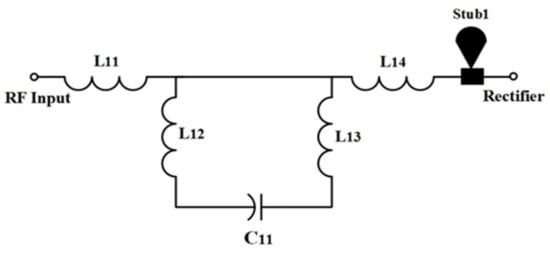 According to the maximum power transfer theorem, if the source’s internal impedance is equal to the load impedance, the maximum power is transmitted from source to load. This is accomplished by placing an impedance matching circuit between the segment of the antenna and the rectifier. The impedance matching depends on the specifically designed frequency bands, whenever the source and load is a reactive component. Thus, the RF bandpass filter section is considered as an impedance matching network. In [38], it was demonstrated that the most frequently used RF filters (as an impedance matching network) are , and , respectively. The proposed RF bandpass filters circuit is a modification of a T-network RF filter. A capacitor is placed between two parallel inductors and two inductors at either end (i.e., forming a modified T-network) to increase the bandwidth and restrain unwanted high-frequency bands near the resonance band [39]. Moreover, additional matching elements, i.e., a radial stub is inserted between the RF filter and rectifier section, as shown in Figure 14.