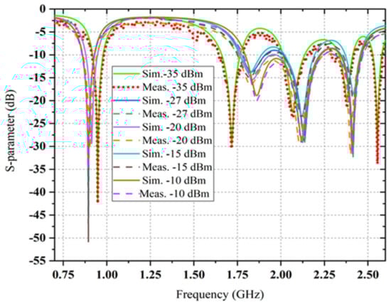 Four different and simple capacitors (i.e., 680 pF, 2.4 pF, 0.6 pF and 220 pF) are used as low-pass filters for different rectifier branches. To feed the sensor, an equivalent impedance is used for the RF harvester load model. Generated dc voltages of the corresponding load level for recently designed sensors are summarized by Table 4. The lowest possible generated voltage trend is very near to the threshold voltage (i.e., about 0.35 V). Their load level varies from 3 kΩ to 25 kΩ. Two realistic load resistance values, such as 6.81 kΩ and 7.5 kΩ, are selected due to higher performance. The simulated and measured S-parameters of the proposed multiband rectifier at six input RF power levels are shown in Figure 17. It can be observed that the suggested multiband rectifier covers the four bands (i.e., which are available at ambient level) for different RF input power density levels.
