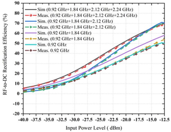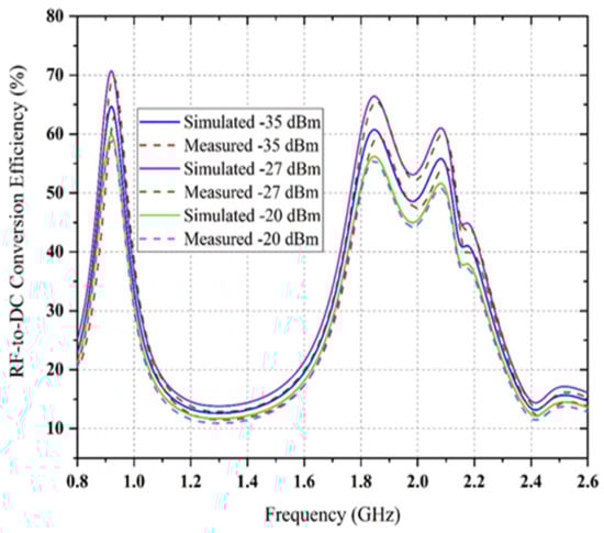 These results (i.e., comparison between simulated and measured reflection coefficient) confirm an excellent correlation at the frequency bands around 0.9 GHz, 1.8 GHz, 2.12 GHz and 2.4 GHz for −5 dBm, −10 dBm, −15 dBm, −20 dBm and −27dBm, while the S11-parameter values at 0.9 GHz, 2.4 GHz and 1.84 GHz have shifted to lower and upper frequencies to cover a higher bandwidth for the −35 dBm RF input power level. The excellent impedance matching (i.e., four parallel RF filter networks) is achieved at the different available frequency bands, such as 0.9 GHz, 1.84 GHz, 2.12 GHz and 2.4 GHz, respectively. This behaviour is probably because of utilizing the realistic SMD elements in the multiband rectifier circuit. The value of SMD capacitors and inductors are a function of frequency. Different series of SMD components with large values (i.e., as best as possible) are used instead of similar products with lower rectifier circuit values to decrease the parasitic effect. The comparison between simulated and measured RF-to-DC rectification efficiency at four different frequencies with three different associated power density levels which is a function of load resistance is presented in Figure 18. Three other frequency inputs with corresponding three RF power density levels in this scenario are 0.9 GHz, 1.84 GHz, 2.12 GHz and 2.4 GHz, −20 dBm, −27 dBm and −35 dBm, respectively.