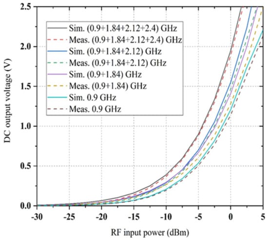 Alongside the impedance change, therefore, the RF-to-DC conversion efficiency is not optimum if some of the incident powers are null or do not have the same value. The comparison between simulated and measured DC rectification efficiency versus frequency for different power density levels is shown in Figure 20. It is shown that the RF-to-DC rectification efficiency is more significant at lower frequency bands (0.8 GHz to 1GHz) and smaller at higher frequency bands (1.8 GHz to 2.5 GHz) for the same RF power density level. This occurred due to parasitic elements’ losses in a particular diode and FR4 substrate material for higher frequency regions. The simulation is conducted for the −20 dBm available RF input power and depicts a 6% enhancement of each sub-band’s peak efficiency. Finally, the generated dc voltage of the proposed rectifier for multi-tone RF input signals has been examined. The comparison between simulated and measured output dc voltage as a function of RF input power density level for multi-tones is shown in Figure 21. It is shown that with the four sources turned on, the dc output voltage is almost equal to the dc total of every dc input of the four RF tones. The circuit is connected to four different RF power generators, with a respective transmission frequency of 0.9 GHz, 1.84 GHz, 2.12 GHz and 2.4 GHz. The measured dc output voltage is determined as a function of ambient RF input power source for the first, second, third and fourth frequency signal. In this sense, the circuit generated resultant dc voltage has been verified in the presence of simultaneous multiple tones.