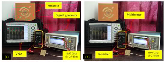 The TSG4104A signal generator is used to input specific frequency signals (available in ambient environment) with the associated RF power level (ambient RF power density level, i.e., −35 dBm to −10 dBm) environment) and a digital multimeter is connected to record the generated dc output voltage. Figure 22 shows the generated 0.354 V (Figure 22a) dc output voltage for 0.97 GHz frequency signal with −35 dBm RF power density level. With the same frequency signal and −27 dBm associated RF power level produced, the dc output voltage reached 0.402 V (Figure 22b). Similarly, generated dc voltage is recorded for different frequency signals (i.e., 1.84 GHz, 2.12 GHz and 2.4 GHz) with RF power density levels of −35 dBm and −27 dBm (since that is the available RF power level in an ambient environment). It is demonstrated that the recorded dc voltage for each frequency with the associated RF power level is reasonable to power any micro-electronic devices.