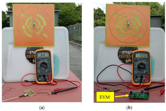 To assess the proposed RF harvester’s realistic performance, a typical ambient outdoor environment with a very low RF power density is selected to measure the performance. In Figure 23a, the RF harvester is placed in an outdoor environment, and a digital multimeter is directly connected to the rectifier load branch for measuring the dc output voltage. The recorded dc output voltage varies from 0.350 V to 0.687 V. The harvested dc output voltage enhanced 0.720 V with the integration of evaluation modules (EVMs) which is shown in Figure 23b. The dc output in dBm can be determined by