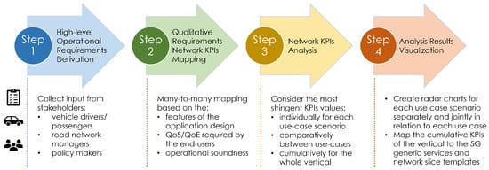 During the first step, the key involved stakeholders (e.g., vehicle drivers/passengers, manufacturers/technology partners, traffic/road operators, national/local authorities, and policymakers) determine a number of high-level operational requirements for each use case. These requirements mostly follow a qualitative approach focusing on the desired type and quantity of information that will be exchanged over the network and reflect user perception as well as traffic/safety regulations and operational soundness.