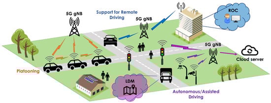 - Hetzer, D.; Muehleisen, M.; Kousaridas, A.; Alonso-Zarate, J. 5G Connected and Automated Driving: Use Cases and Technologies in Cross-border Environments. In Proceedings of the 2019 European Conference on Networks and Communications (EuCNC), Valencia, Spain, 18–21 June 2019; pp. 78–82. [Google Scholar] [CrossRef]