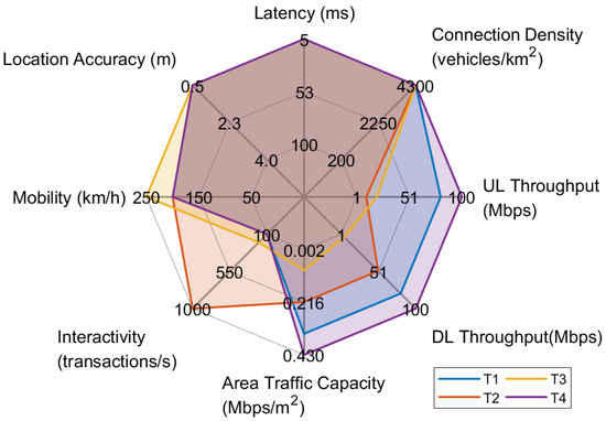 Table 2 and Figure 3 also highlight the conservative requirements in terms of interactivity for all use cases except T2. The safety information exchanged between the vehicles and the network infrastructure, such as precise digital maps of intersections, the status of traffic signals, the locations of vehicles and vulnerable road users, and the drivers’ physiological status, is related to the smart junctions and network assisted and cooperative collision avoidance (CoCA) and the human tachograph scenarios and consists of payloads that are time-critical and dense within a very short period of time. As a consequence, the use case T2 is the only one with a demand of high interactivity (up to 1000 transactions/s). Finally, high security/privacy is needed across the whole vertical, as confidential/sensitive data is exchanged between the drivers/passengers and vehicles, intended for real-time operation.