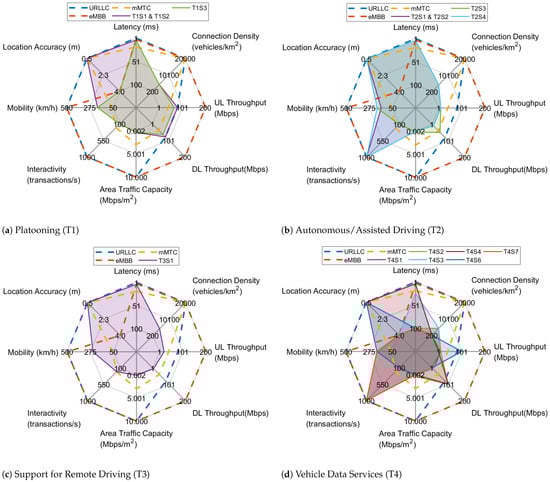 The aforementioned vehicular services—or equivalent use cases—have different objectives, posing specific requirements to the overall system architecture. Accordingly, the qualitative requirements collected from the stakeholders participating in the 5G-HEART consortium are mapped to measurable network KPIs with specific target values, following the methodology presented in Section 2.3. The most stringent values of the selected KPIs for each use case/service category, calculated by overlapping the determined values of the corresponding individual scenarios, are presented in Table 2 and summarized in the form of a radar chart in Figure 3. In the following, we elaborate more on the explanation and interpretation of the resulting KPIs according to each use case’s main objective and functionality and based on the users’ expectations upon usage.