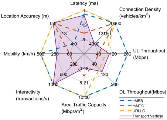 Figure 5 presents the aggregated KPIs of the four individual vehicular services in relation to the three 5G service types. Each use case presents different requirements, demonstrating that a combination of eMBB, URLLC, and mMTC slices is required for the entire vertical, paving the need for subsequent network slices tailored to its particular KPIs. Specifically, URLLC and eMBB combined slices are needed in order to meet the target values of latency, mobility, UL/DL throughput, and reliability, while the need for mMTC slice is suggested by the demand for high location accuracy and the use of a potentially large number of multiple sensors.