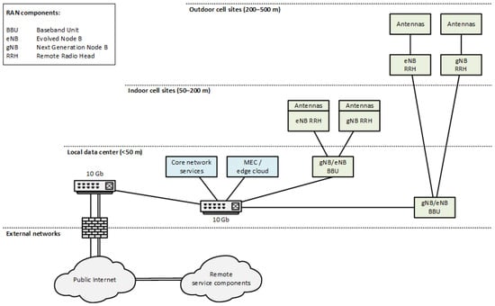 The preliminary validation trials discussed in Section 7 have been performed at the 5G Test Network (5GTN) test facility in Oulu, Finland. The test facility architecture providing a fully controlled 5G network based on commercial 5G equipment and spectrum is presented in Figure 6. From the technological perspective, the infrastructure offers a realistic testing environment for a variety of vertical services that can be deployed into the architecture using the edge cloud resources provided by the facility or using a remote connection, e.g., by using Virtual Private Network (VPN) tunnelling over the public Internet. The 4G Evolved Packet Core (EPC) and 5G Core Network (5GC) Virtual Network Functions (VNFs) as well as the edge cloud environment are hosted as Virtual Machines (VMs) on dedicated server hardware in a local data centre residing in the same building with the test network cell sites. The virtualization of the services is based on OpenStack and VMware software platforms. The transport network infrastructure used for backhaul and fronthaul connections in the building is based on 10 Gb fibre links. The maximum link distances in the backhaul and fronthaul for the presented measurements are a few hundred meters. Measurement of the network traffic is performed at the IP-layer using synchronized software-based passive Qosium measurement probes [], which can be activated in different locations of the overall data path at the edge cloud, 5GC, and RAN, as well as in the 5G User Equipment (UE). In the measurements reported in Section 7, one measurement probe was placed on the measurement server in the edge cloud and one on the UE residing in an otherwise empty 5G cell.