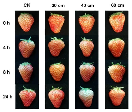Strawberry is a fruit that is loved by a wide range of consumers due to its juicy taste, unique tangy-sweet taste, and wealth of nutrients, vitamins, and minerals. Nevertheless, strawberry is soft and, therefore, very vulnerable to mechanical damage during the post-harvest supply chain. Impact, compression, and vibration are the main mechanical forces that can cause fruit damage [1,2]. When fruit is mechanically damaged, its physiological metabolism becomes abnormal, such as quick softening [3], water losses [4], and oxidation browning [5]. Moreover, the mechanically damaged fruit is also more susceptible to infection by bacteria and fungi, which can easily cause fruit decay and affect fruit safety [6]. Therefore, mechanically damaged fruit is not suitable for further storage and sale, which, in turn, leads to a significant decline in the market value of the product.