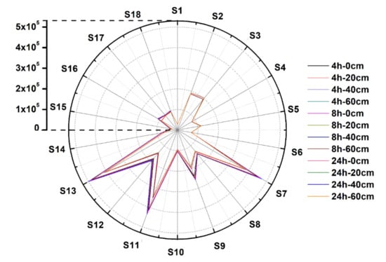 Figure 2 shows the average response data of the e-nose signal for strawberries that have suffered different extents of impact and have been stored for different times after the occurrence of the impact. In Figure 2, 18 e-nose sensors are represented by 18 angles from 0° to 340°, respectively. The spacing between each sensor is 20°. Specifically, the vectors with radii of angles 0° and 340° in Figure 2 represent Sensor 1 and Sensor 18, respectively. The upper left corner of the polar plot shows the scale of the sensor responses. Among them, Sensors 2, 3, 7, 9, 11, 12, and 13 had high response values. It can be seen that there are differences between the e-nose signals of the strawberries when they have been subjected to different extents of impact damage and stored for different periods of time, but these differences are difficult to distinguish by the naked eye in the figure. On the other hand, it should be noted that when more samples of e-nose data are displayed in the polar plot, there will be a serious overlap between the data, which makes it more difficult to perform direct visual analysis. Therefore, multivariate algorithms were used next to build models to achieve the detection of strawberry fruits that have suffered impact damage.