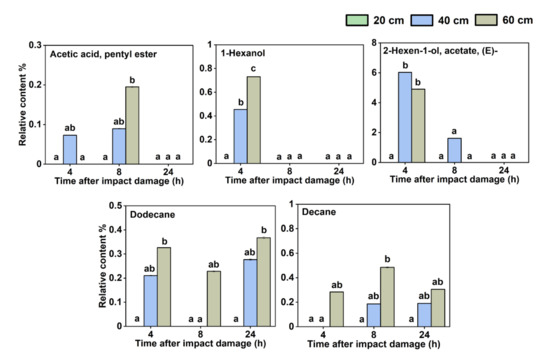 The relationship among the content of each VOC, the impact extent, and the storage time were further analyzed, and it was found that different impact damage extents and different storage times after impact caused some regular changes in the content of some VOCs. There were five VOCs whose relative content was related to the extent of impact damage suffered by the fruit (Figure 3), including acetic acid, hexyl ester, 1-hexanol, 2-hexen-1-ol, acetate, (E)-, dodecane, and decane. These VOCs were not detected when the impact height was 20 cm but were detected when the impact heights were 40 and 60 cm; the higher the impact height, the higher the substance content. However, some of them could be detected 4 and 8 h after impact but not detected at 24 h. This shows that these VOCs could be accumulated after the fruit is damaged by impact, but as the storage time increased after the impact, their content decreased, which may be related to the metabolic degradation of these VOCs in the fruit.
