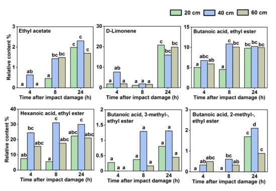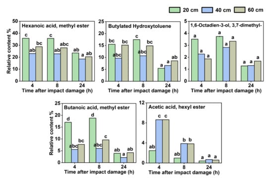 In addition, Figure 6 illustrates five VOCs whose relative contents decreased with increasing storage time after impact onset, including hexanoic acid, methyl ester; butylated hydroxytoluene; 1,6-octadien-3-ol, 3,7-dimethyl-; butanoic acid, methyl ester; and acetic acid, hexyl ester. There were two other VOCs among them whose content changed in relation to the extent of impact damage the fruit suffered. Butanoic acid, methyl ester accumulated significantly more at the impact height of 20 cm than those at 40 and 60 cm, while acetic acid, hexyl ester accumulated significantly more at the impact heights of 40 and 60 cm than at 20 cm.