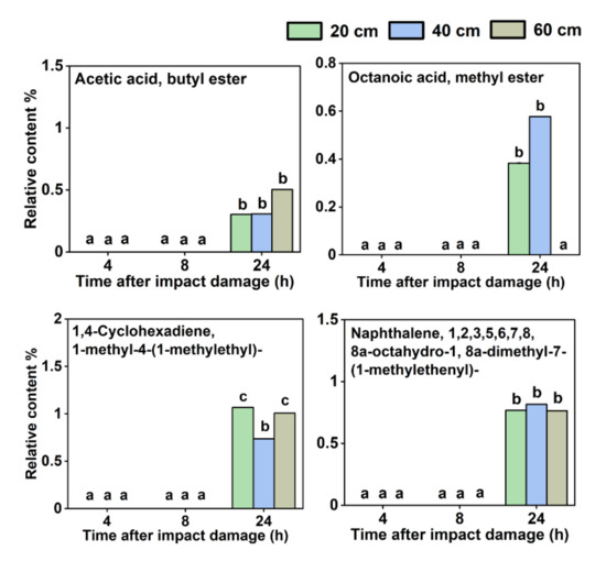 Four VOCs detected only in the later stage of storage after the fruit had been impacted. Different letters (a, b, c, d) indicate significant differences (p < 0.05).