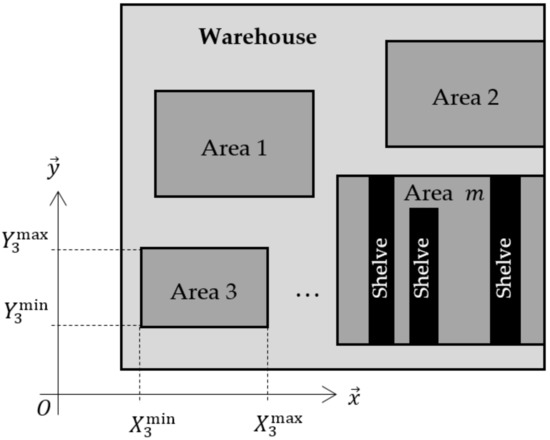 Let us consider an indoor environment such as a warehouse. It includes several rectangular storage areas containing shelves, as illustrated in Figure 2. Each storage area can have its own organization changed, i.e., the shelves’ position and quantity can be modified according to the products stored. Consequently, the corridors between the shelves are not fixed. Outside the storage areas, the movements are free. For circulation convenience, all shelves are parallel to the axis.