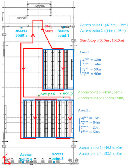 Warehouse under consideration with the 425 m journey done by the robot and the localization of the different Wi-Fi access points and storage areas.