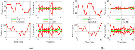 Position with respect to the time: (a) without application of constraints; (b) with application of the constraints. The right part of plots (a,b) are the error (difference between real and estimated position) and the confidence interval , where STD is the standard deviation: for the X-axis and for the Y-axis.