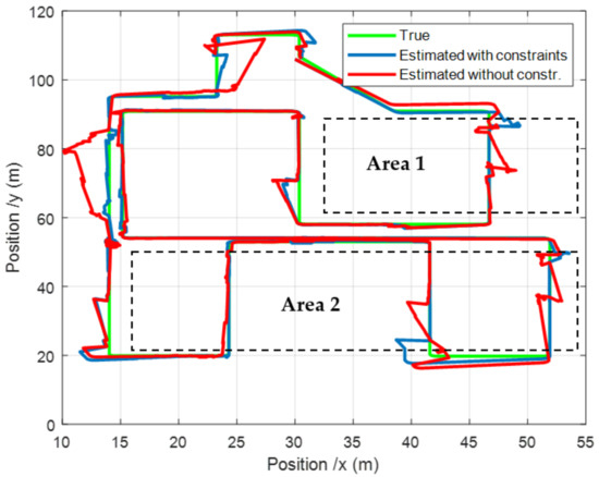 Let us now discuss about the results presented in the previous section. It can clearly be seen in Figure 7 that taking into account the speed constraint leads to a better tracking of the trajectory. It is true in the storage areas, but it also has a positive impact outside, because the heading estimate is more accurate. This can especially be observed in the last part of the route, when the robot is leaving the area 2. It can also be noticed that the constraint allows for a faster realignment of the estimated trajectory to the real one after each abrupt 90° turn. Such situations are usually tricky because of the difficulty to accurately estimate the heading.
