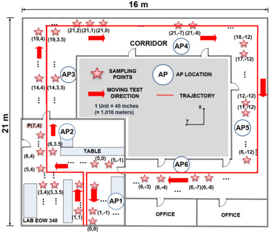 Experiment in the engineering office wing at University of Victoria, considering open datasets [27]. The six access points were located at the AP circles.