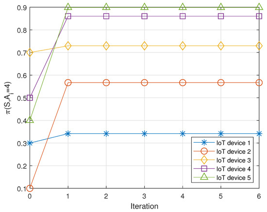 Meanwhile, from Figure 2, it can be found that each IoT device chooses its action by considering the other devices’ actions at the best response. Specifically, after the convergence, because IoT device 1 chooses the maximum transmission power (i.e., ) with low probability, other IoT devices choose the maximum transmission power with a higher probability to improve the expected SINR.