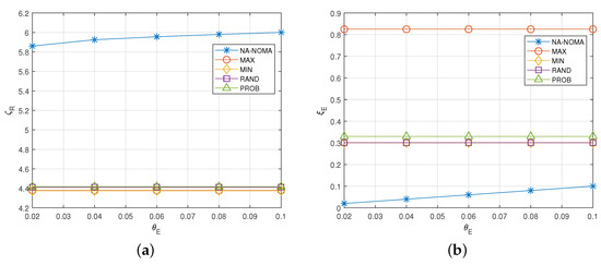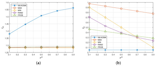 Meanwhile, from Figure 3a, it can be observed that of NA-NOMA increases as increases. This is explained in the following. High indicates that IoT devices can transmit data without any concern about the energy outage. In this situation, IoT devices in NA-NOMA aggressively exploit high transmission power. Meanwhile, because the other schemes do not adjust their transmission policies by considering the energy harvesting probability, their average aggregated data rate is constant regardless of (see Figure 3a), and their energy outage probabilities decrease as increases (see Figure 3b).