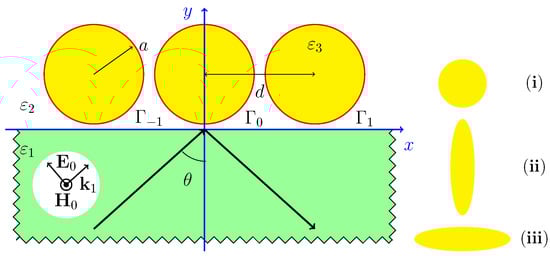 Recently, the study of the plasmon–enhanced local field in the array of parallel circular metallic cylinders was proposed to improve sensitivity to refractive index variations [] regarding rapid changes in the Fresnel coefficients near the angle of total internal reflection (TIR). We had analyzed the grid of parallel metallic cylinders between two dielectrics; see [] and references therein. The idea of the boundary element method (BEM) is to reduce the Maxwell equations to boundary integral ones applying the Green theorem. In the case of a grid with parallel cylinders, the Floquet theorem reduces the problem of one cylinder within one elementary cell. To obtain analytical formulas, we exploited simplified models. The sequence of nanowires can be approximately replaced by a thin layer with averaged permittivity []. The model offered approximate angular dependence but never yielded quantitative agreement. In the present paper, we treat more general models of a layer with an anisotropic dielectric tensor. Cylinders of the elliptical cross-section with different orientations are compared with the model, demonstrating its advantage.
