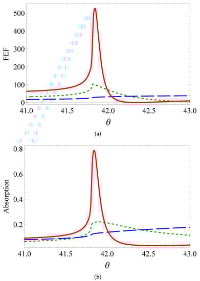 Absorption in Figure 2b correlated well with FEF in Figure 2a. The most intensive electric field and accordingly the largest damping were precisely achieved in plasmon resonance. To a certain extent, the absorption characteristics reproduced the angular dependence of FEF. The transmittance presented in Figure 2c vanished at a greater angle than that of the TIR. The angular distribution of the horizontal ellipses had a similar shape to that of a resonance curve. For other cross-sections, we saw a substantial broadening. The curve was wider for the vertical ellipses, and in FEF and absorption.