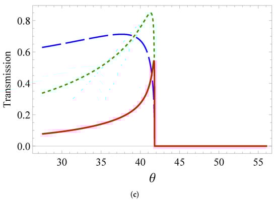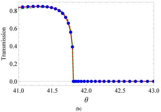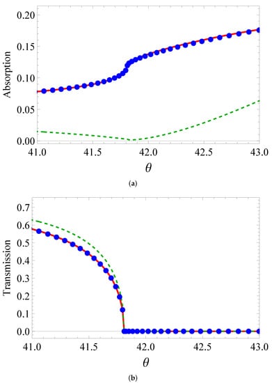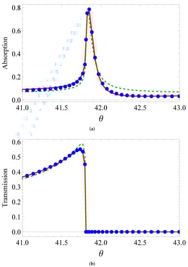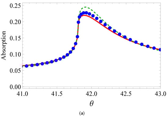 These coefficients mean the ratio of transmitted through the layer and reflected energy flux to the incident one. So, transmittance , reflectance , and absorption give the unity. Then, to obtain absorption coefficient . Here, absorption is specific, i.e., normalized by period d and . If phase shift tends to zero, Equations (7) and (8) become simpler and turn into Fresnel’s ones for two half-spaces with common boundary plane. If the anisotropic layer becomes isotropic , then transmittance (7) coincides with the found one for magnetic field [,]. The model of the stratified medium with scalar dielectric constant is widely used in calculations of reflectometer sensitivity []. For reflectometry sensors based on a metallic–dielectric structure, ref. [] the model agrees with measurements. Formulas for anisotropic dielectric permittivity tensors are used in papers devoted to hyperbolic metamaterials.