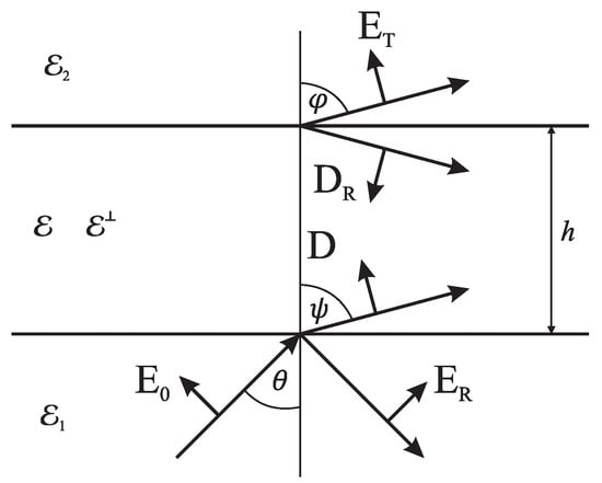 The model was a thin film with permittivity for the isotropic material. In the anisotropic case, the permittivity tensor had two diagonal components, . The incidence angle was , the inside layer refraction angle was , and the transmittance angle was . Electric fields of reflected and transmitted waves are and , respectively. Vectors of electric displacement and were orthogonal to their wavevectors inside the layer.