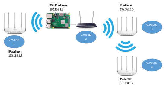To test medium-range communications, several APs were wirelessly interconnected to form multiple LANs via WiFi. An RSU was connected via ethernet to the AP infrastructure to receive information from any potential OBU connected to the network. Each Access Point, OBU, and RSU was assigned a static IP Address, and the communication between the RSU and OBU was established using web Sockets with TCP protocol. Figure 2 shows a simple diagram of the network topology.